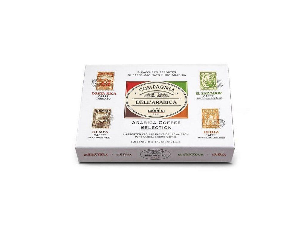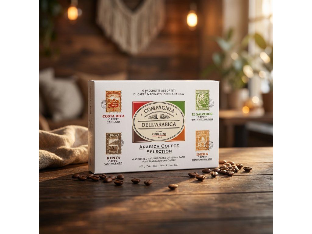 Elegantní degustační set čtyř jednodruhových arabik od italské pražírny Corsino Corsini S.p.A.. Ideální jako reprezentativní dárek i pro milovníky výběrových chutí, kteří chtějí porovnat charakter jednotlivých terroir.