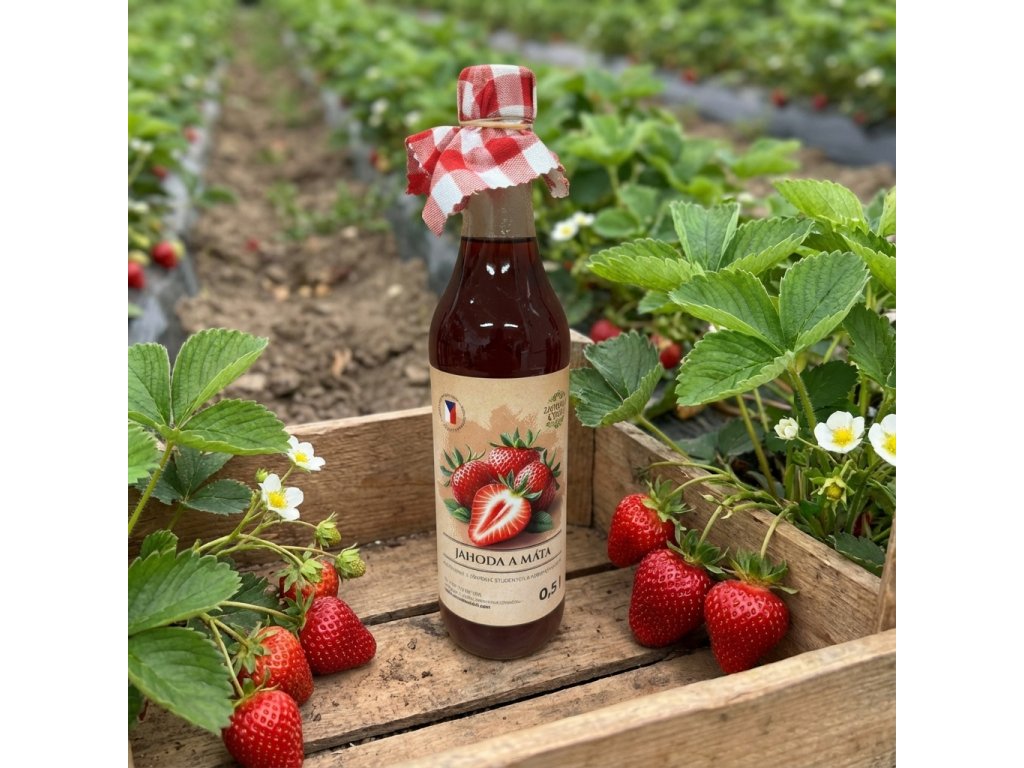 Sirup je vyráběn ručně z pravých jahod a čerstvých lístků máty, bez barviv a aromat. Výsledek? Vyvážená, přirozená chuť, která potěší v každém ročním období.