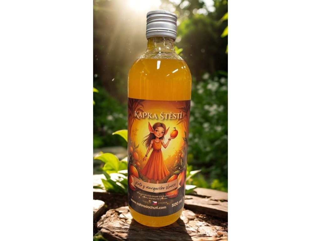 Smíchej Kapku štěstí s perlivou vodou, přidej plátek pomeranče a trochu ledu – vznikne nápoj, který voní jako tropické ráno a chutná jako radost sama. 🥭