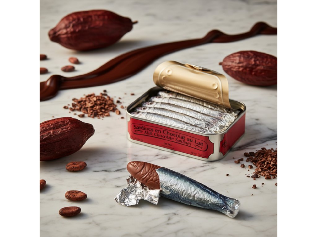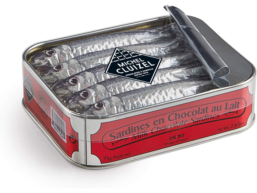 Michel Cluizel – 5 mléčných čokoládových sardinek v konzervě je originální sladká specialita z kvalitní 39% mléčné čokolády. Realisticky zpracované sardinky v plechové konzervě spojují hravý design s prvotřídní francouzskou čokoládou.