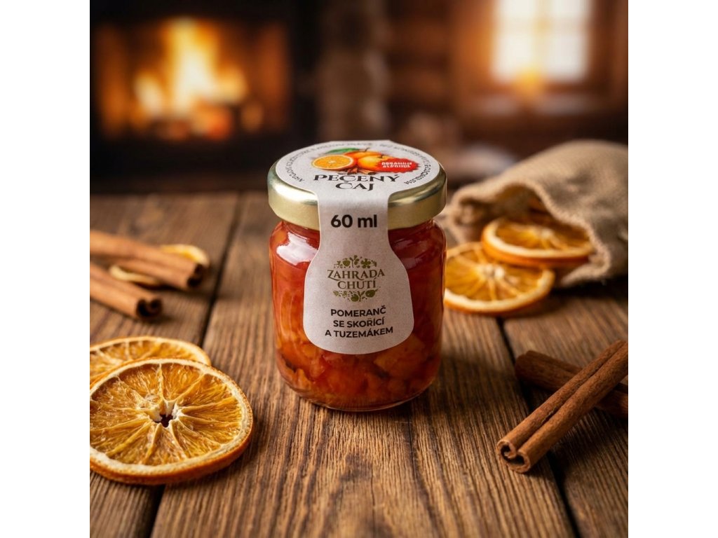 Pečený čaj Pomeranč se skořicí a tuzemákem je jako objetí v hrnku – šťavnaté kousky pomeranče, podmanivá vůně skořice a sladký akcent tuzemáku tvoří harmonii chutí, která vás zahřeje i v těch nejchladnějších dnech.