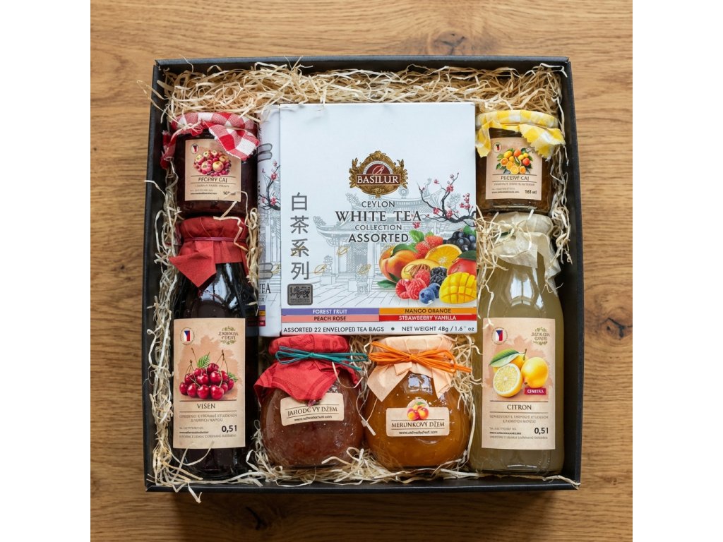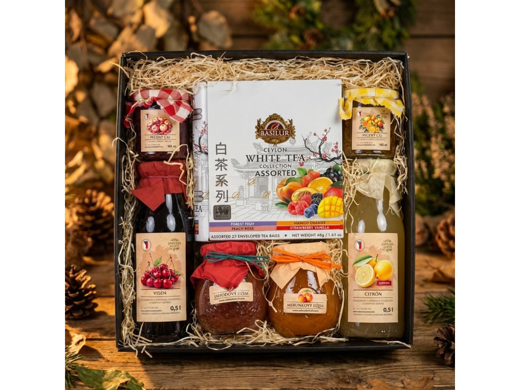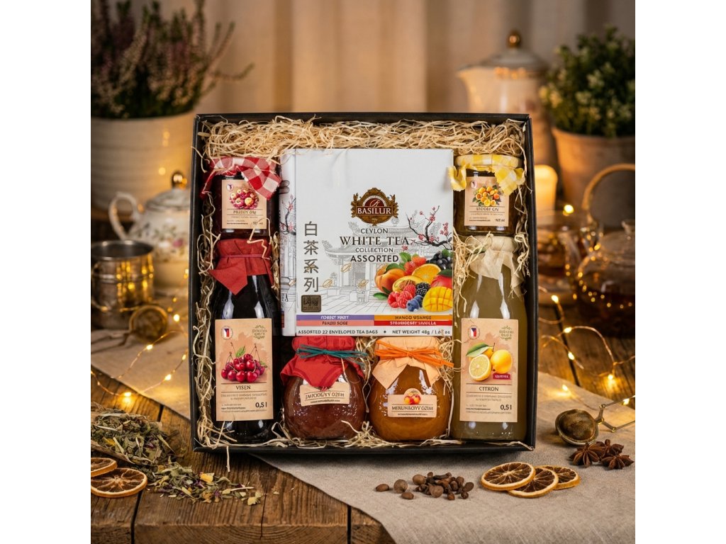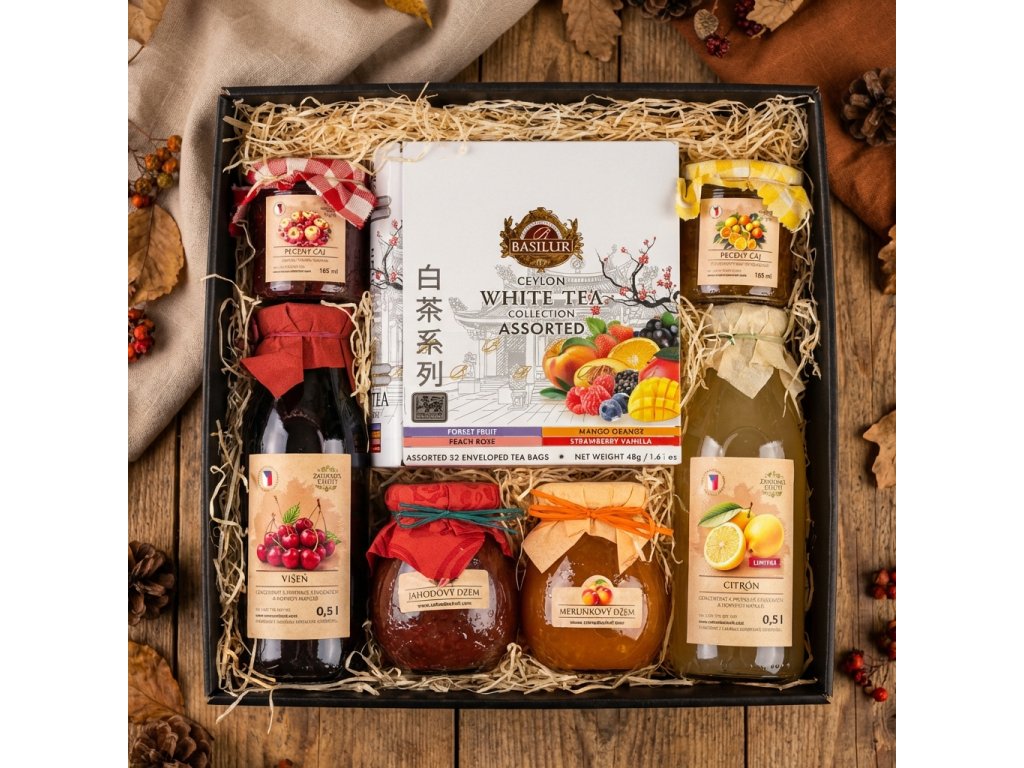 Sedm chutí zahrady je dárkový set, který spojuje to nejlepší ze Zahrady chuti do jednoho harmonického celku. Obsahuje 2× sirup, 2× džem, 2× pečený čaj 165 ml a 1× prémiový čaj Basilur. Ideální jako rodinný dárek i reprezentativní pozornost.