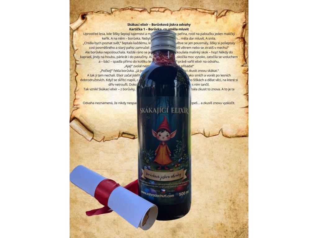 Náš Skákací elixír – Borůvková jiskra odvahy v sobě nese právě tohle kouzlo – sladkost borůvek, lehkost léta a jiskru, která tě zvedne z místa.